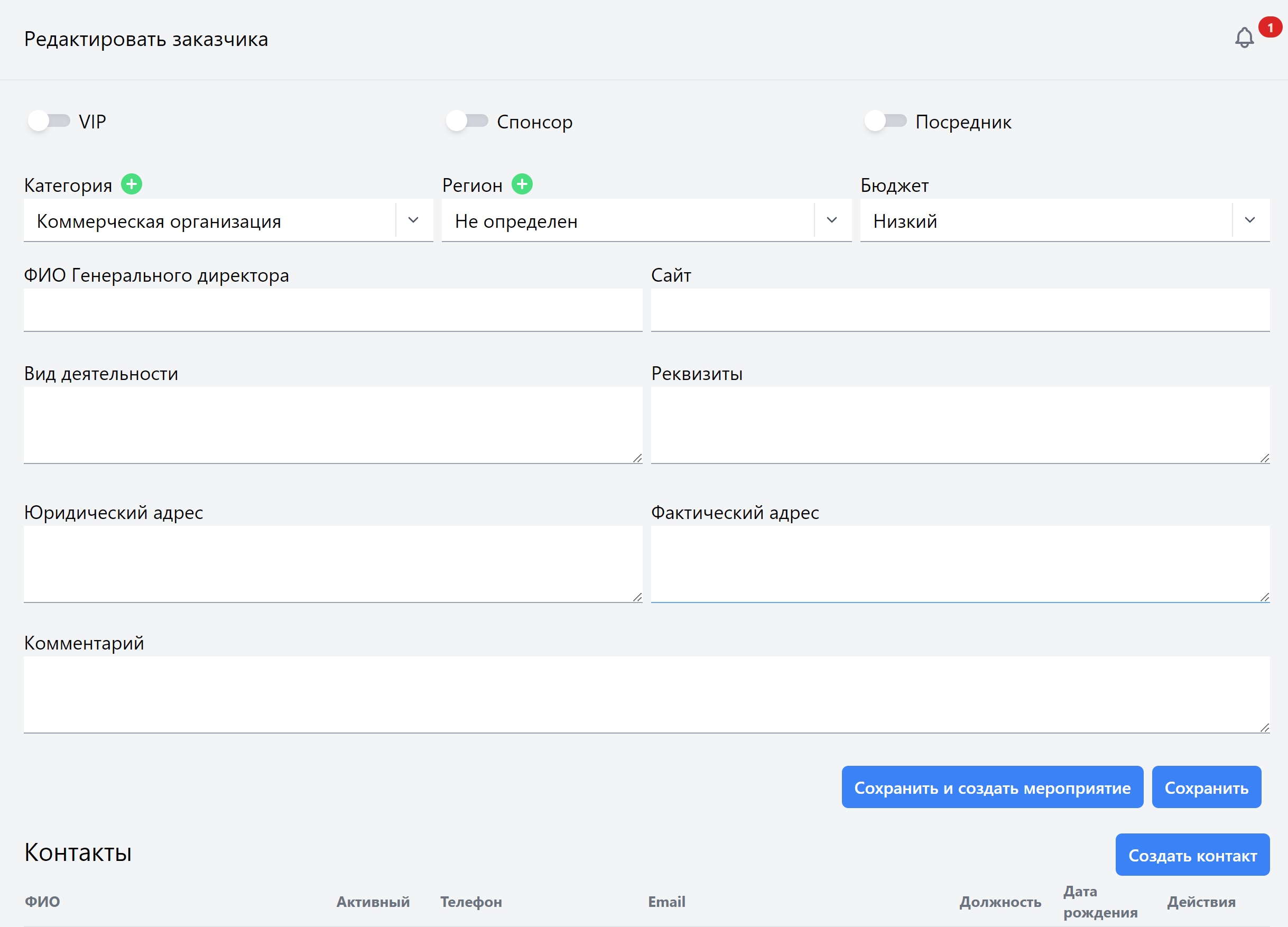 Дополнительно доступна кнопка "Сохранить и создать мероприятие", которая в случае успешного сохранения переадресует на создание мероприятия с подставленным текущим заказчиком
