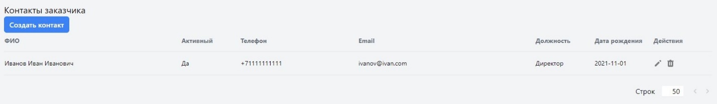 Управление контактами доступно в форме "Редактирование заказчика". Для создания нового контакта нажмите кнопку «Создать контакт». Для того чтобы перейти к редактированию уже добавленного контакта - нажмите кнопку в колонке «Действия». Формы создания и редактирования контакта полностью идентичны.