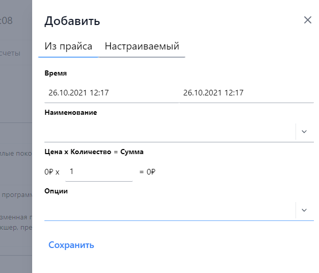 Добавляет пункт с использований прайс листа системы, при выборе наименования становится доступным выбор дополнительных опций, соответствующих заданному наименованию. При подстановке цены учитываются предварительно заданные в настройках «Несезонные» интервалы и в поле цена автоматически подставляется соответствующее значение