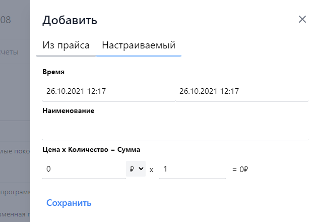 В настраиваемом варианте наименование вводится вручную, цена и валюта доступны для редактирования и не предусмотрено создание опций, вводимая цена может быть отрицательной для реализации скидки.