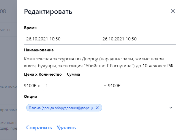 Значения цены, опций и наименования для добавленных из прайса пунктов зафиксированы на момент добавления. В случае если цена в прайс листе поменялась и необходимо использовать новую, требуется пересоздать пункт. Настраиваемые значения полностью доступны для редактирования. При необходимости можно удалить пункт кнопкой «удалить».
