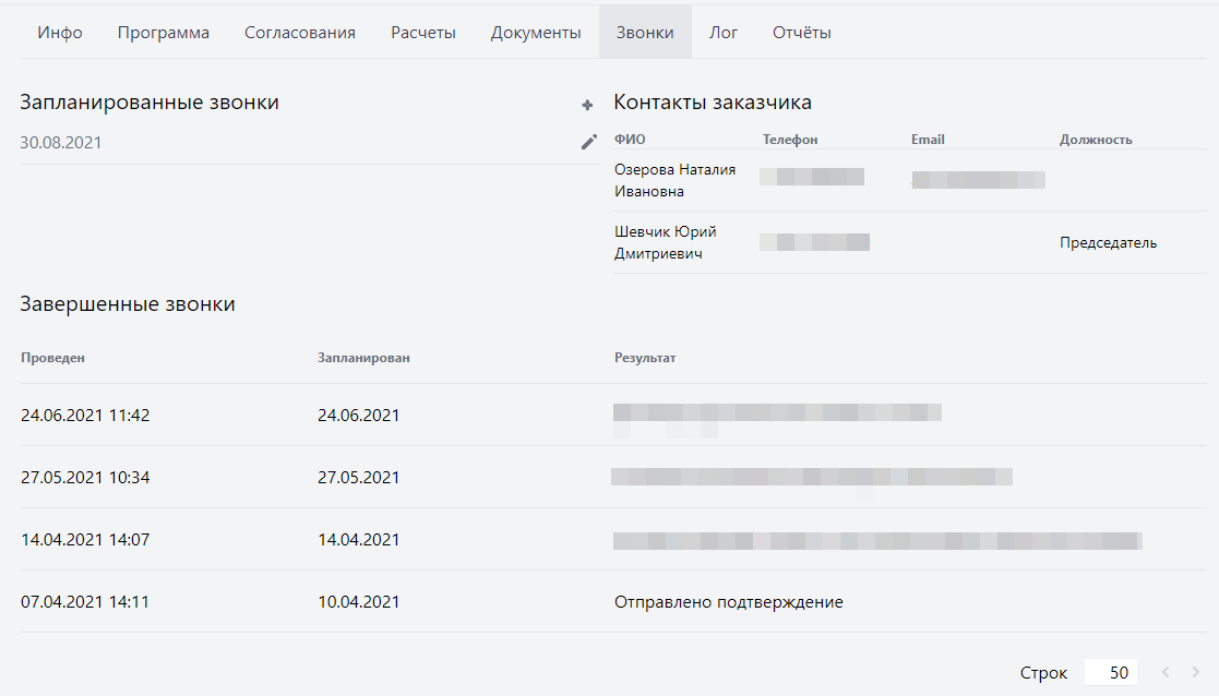«Завершенные звонки» - содержит лог выполненных звонков, с указанием даты проведения (поле сортировки, самые последние сверху), запланированной даты выполнения звонка, Комментария о результате выполнения звонка.