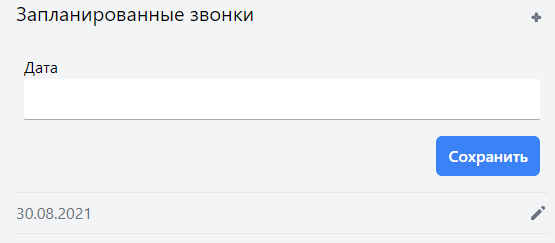 Встраивает поле с датой на которую планируем звонок, форма закрывается либо повторным нажатием на «+», без сохранения, либо кнопкой «Сохранить» с сохранением.
