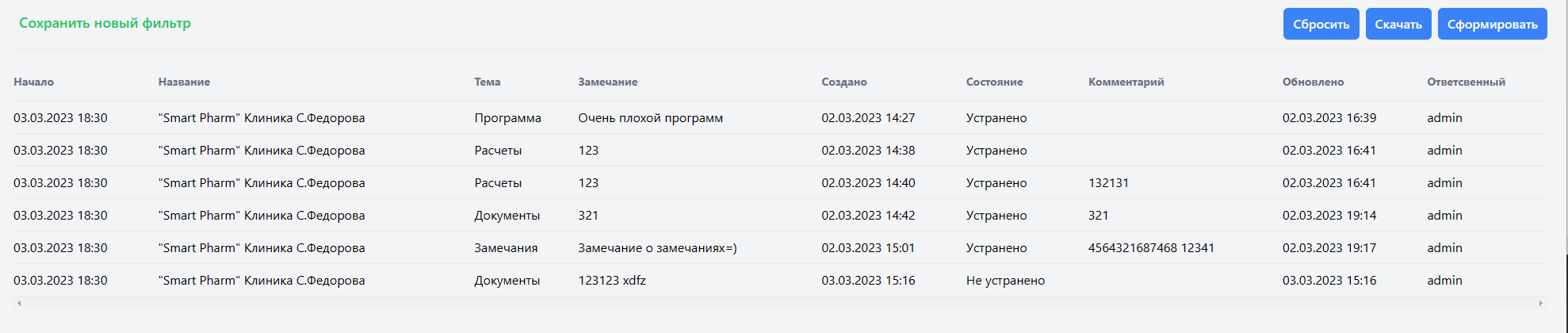 Отчет о замечаниях находится в разделе аналитика. В качестве фильтра выступает стандартный для аналитического раздела фильтр по мероприятиям.