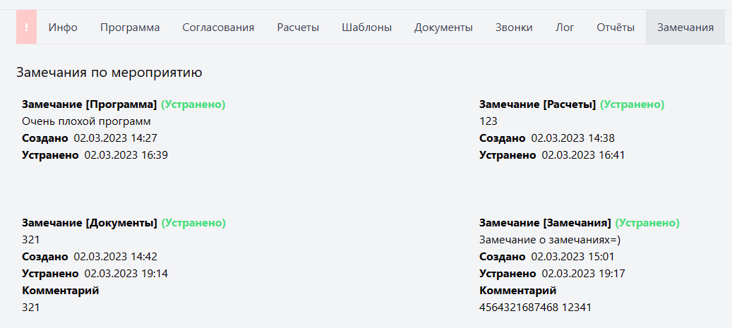 Раздел замечаний предназначен для закрепления замечаний, в виде текстовых сообщений, привязанных к разделу к которому относится замечание, а также ответсвенному за мероприятие пользователю.
