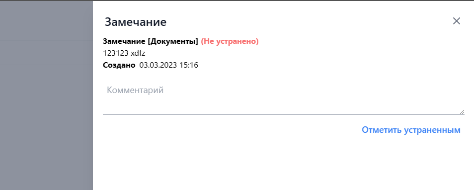 Для установления замечанию статуса "Устранено" требуется сотрудником, которому выставлено замечание, открыть всплывающее окно с деталями о замечании, путем нажатия на замечание в списке, или в разделе задач, и нажать кнопку "Отметить устраненным". При желании, в поле коментарий, можно оставить сообщение.