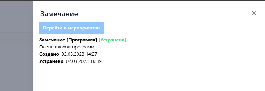 При открытии замечания доступна дополнительная кнопка, перейти к мероприятию