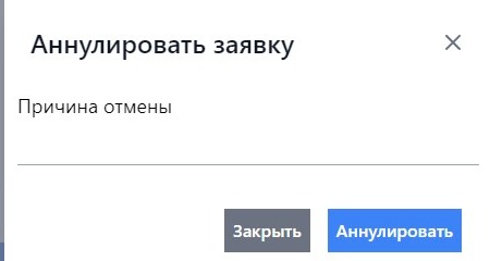 При нажатии на кнопку "Аннулировать" в просмотре заявки справа появится всплывающая область, где необходимо указать причину аннулирования.