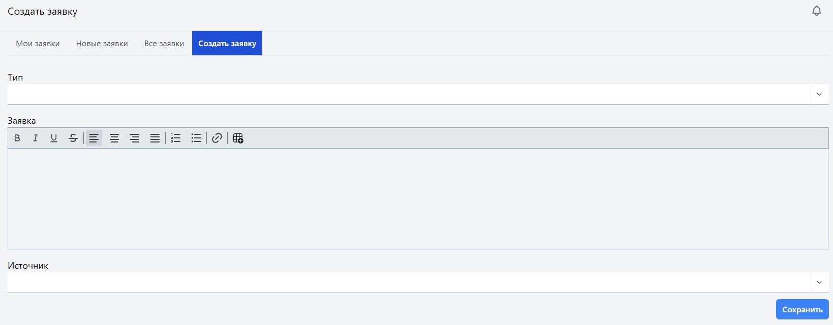 Для создания заявки нажмите на кнопку "Создать заявку" в верхней части раздела заявок. Необходимо указать тип заявки, её текст, а также выбрать источник.