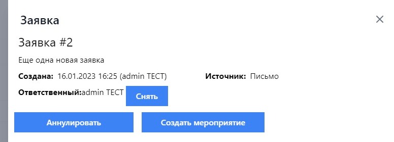 Данную заявку можно привязать к создаваемому мероприятию, если использовать кнопку "Создать мероприятие" в разделе заявок. При этом вы будете переадресованы на стандартную форму создания мероприятия, дополненную отображением текста заявки. В последствие, текст заявки будет отображаться в информации о мероприятии.