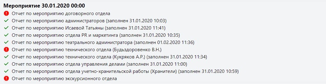 Список отчётов для просмотра/заполнения доступен в разделе "Отчёты" главного меню, а также во вкладке "Отчёты" при просмотре детальной информации о мероприятии. Каждый отдел видит только отчёты, относящиеся к нему.