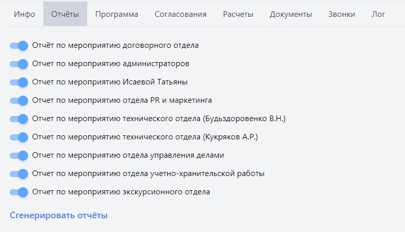 Отчёты для каждого из отделов отправляются на заполнение сотрудником договорного отдела. При создании отчётов пользователям, ответственным за заполнение, приходит специальное уведомление. Ответственным пользователем от договорного отдела является сотрудник, добавивший мероприятие в систему. Для того чтобы сгенерировать отчёты ответственному сотруднику необходимо зайти в детальную информацию о мероприятии и перейти во вкладку "Отчёты". Здесь можно выбрать отделы, для которых будут созданы отчёты. После того как отделы выбраны необходимо нажать на кнопку "Сгенерировать отчёты". Отчёты будут созданы для выбранных отделов (договорной отдел выбран всегда), а уведомления об этом отправлены ответственным пользователям.