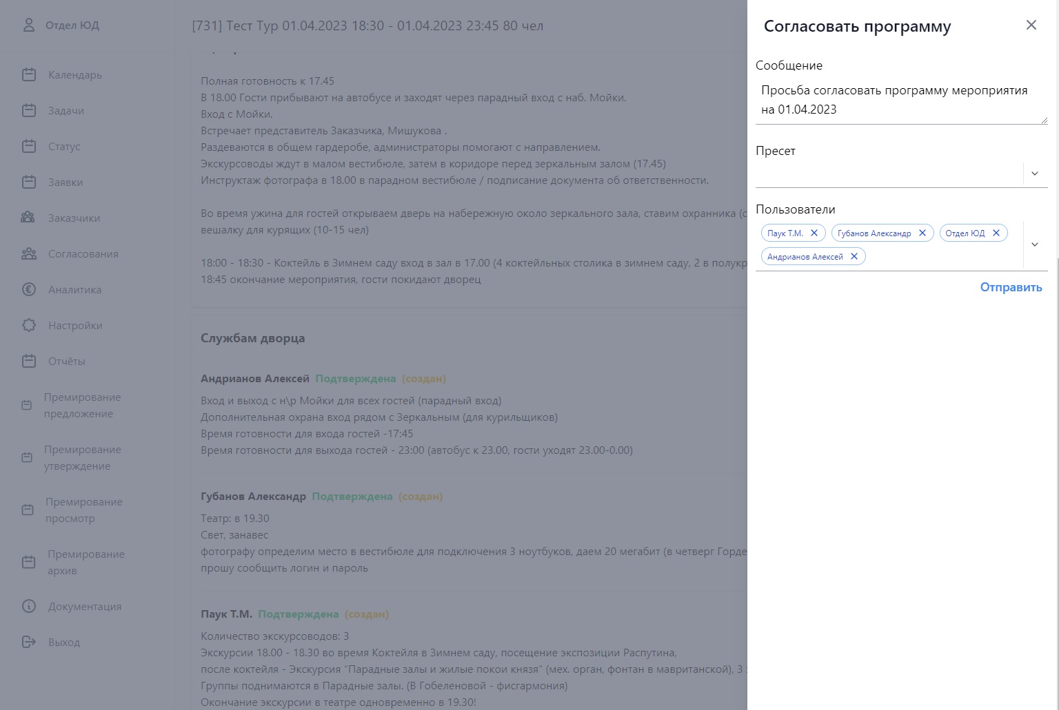 Сотрудник ОПОМ в списке согласований выбирает всех задействованных лиц и рассылает им уведомление о необходимости согласования программы мероприятия.