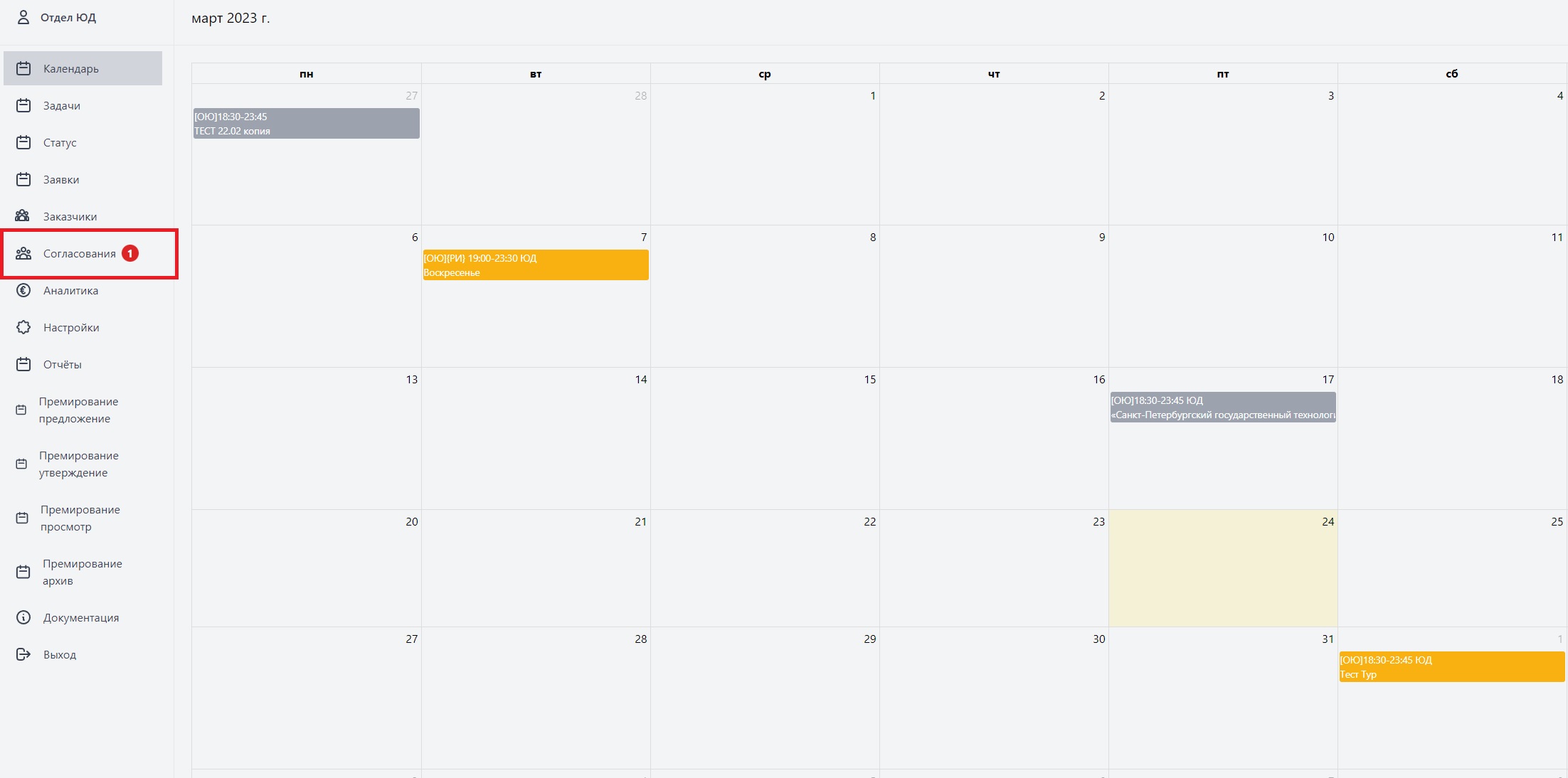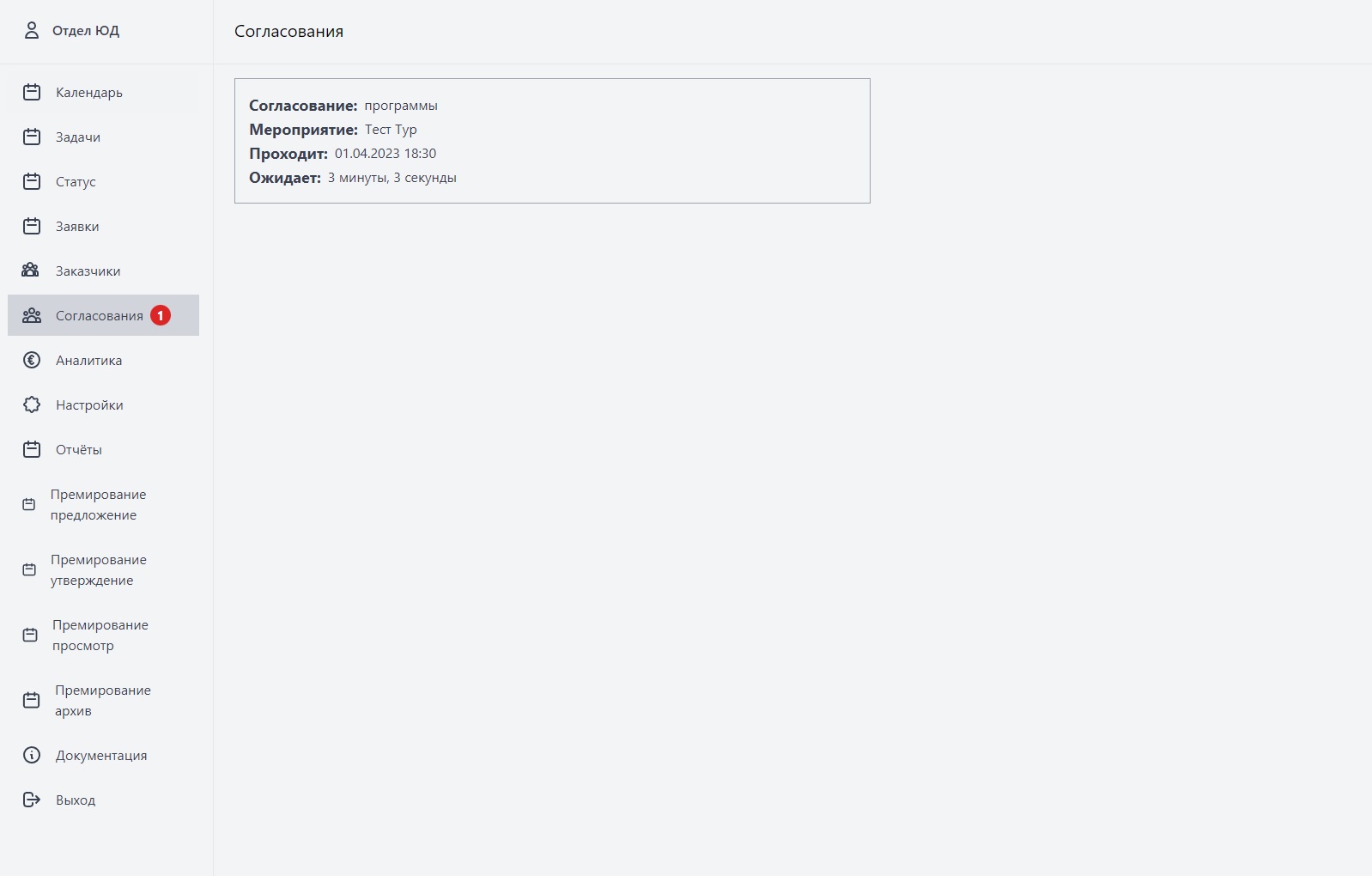 Сотрудникам приходит уведомление о необходимости согласования программы мероприятия на почту и в систему. Список всех активных согласований в которых участвует сотрудник находится во вкладке «Согласования»