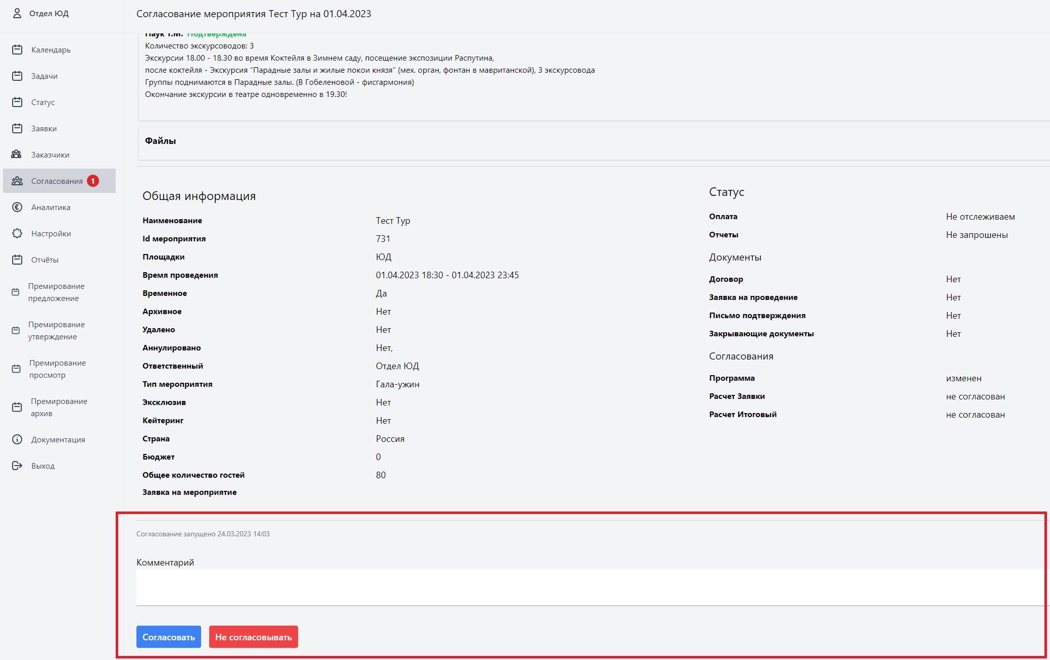 После получения уведомления о согласовании программы мероприятия сотрудник отдела должен приступить к согласованию. После проверки всех данных мероприятия на странице согласования необходимо выбрать один из двух вариантов в самом низу страницы